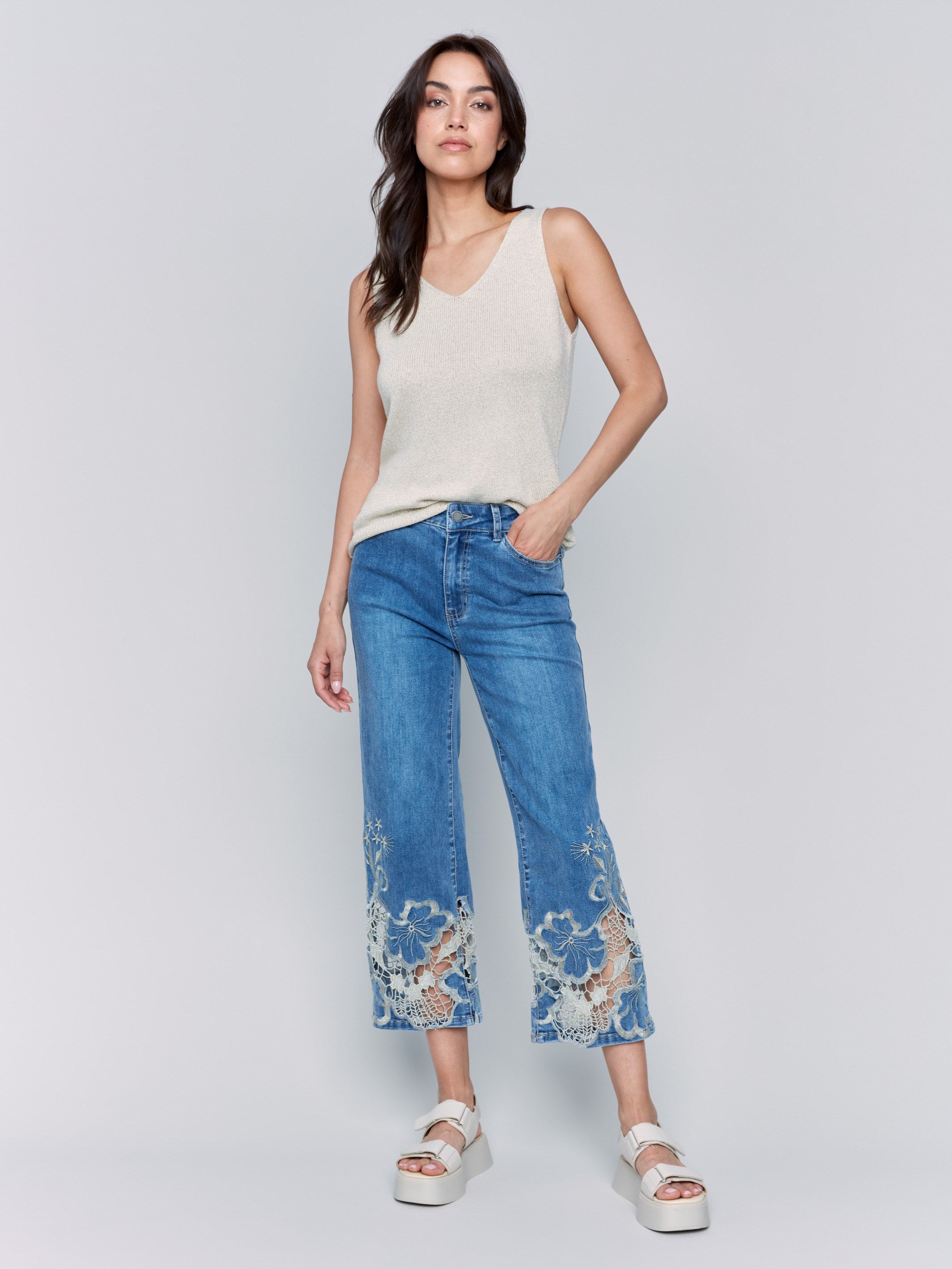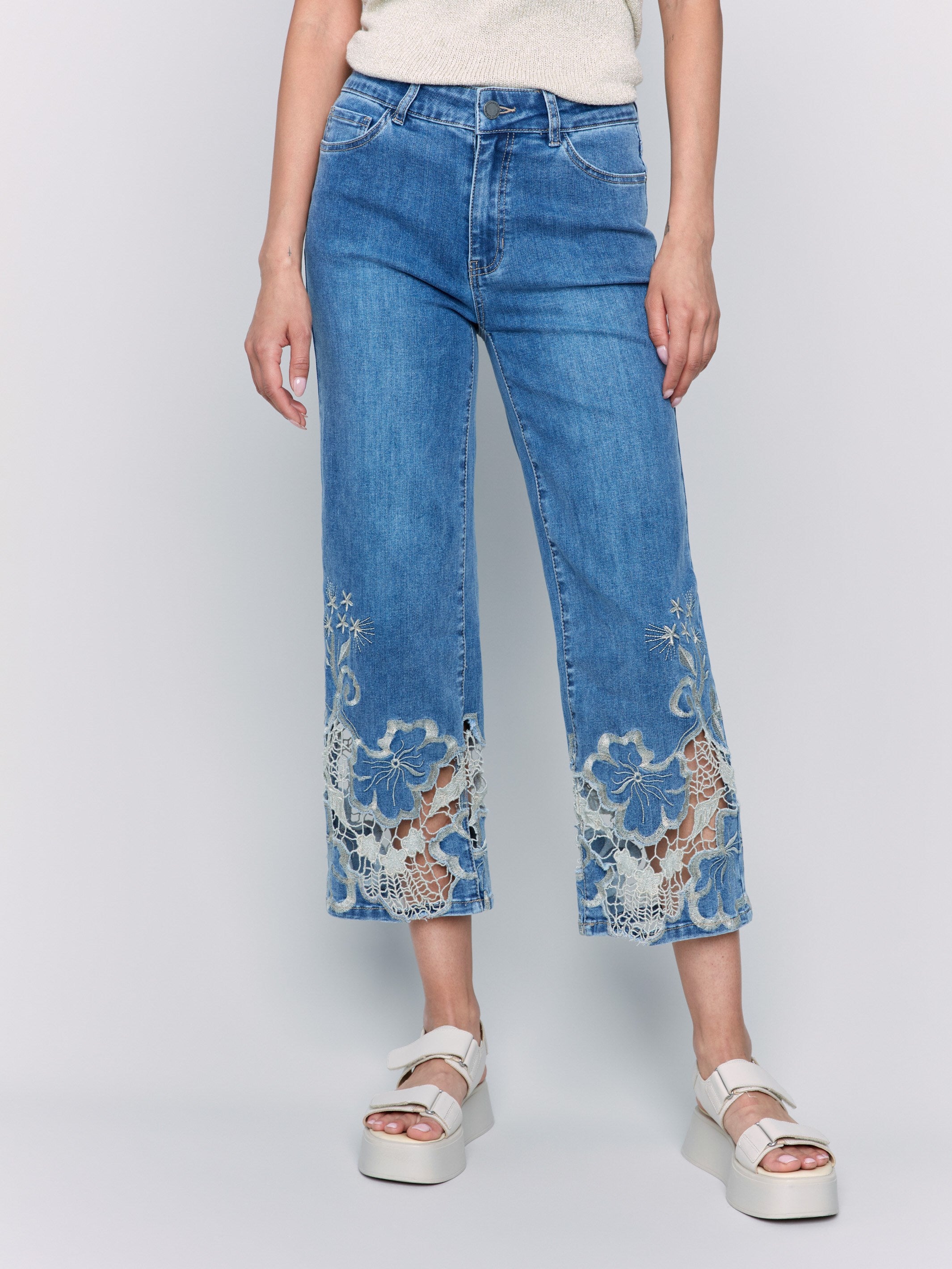 Cropped Flare Leg Jeans with Lace Hem - Medium Blue