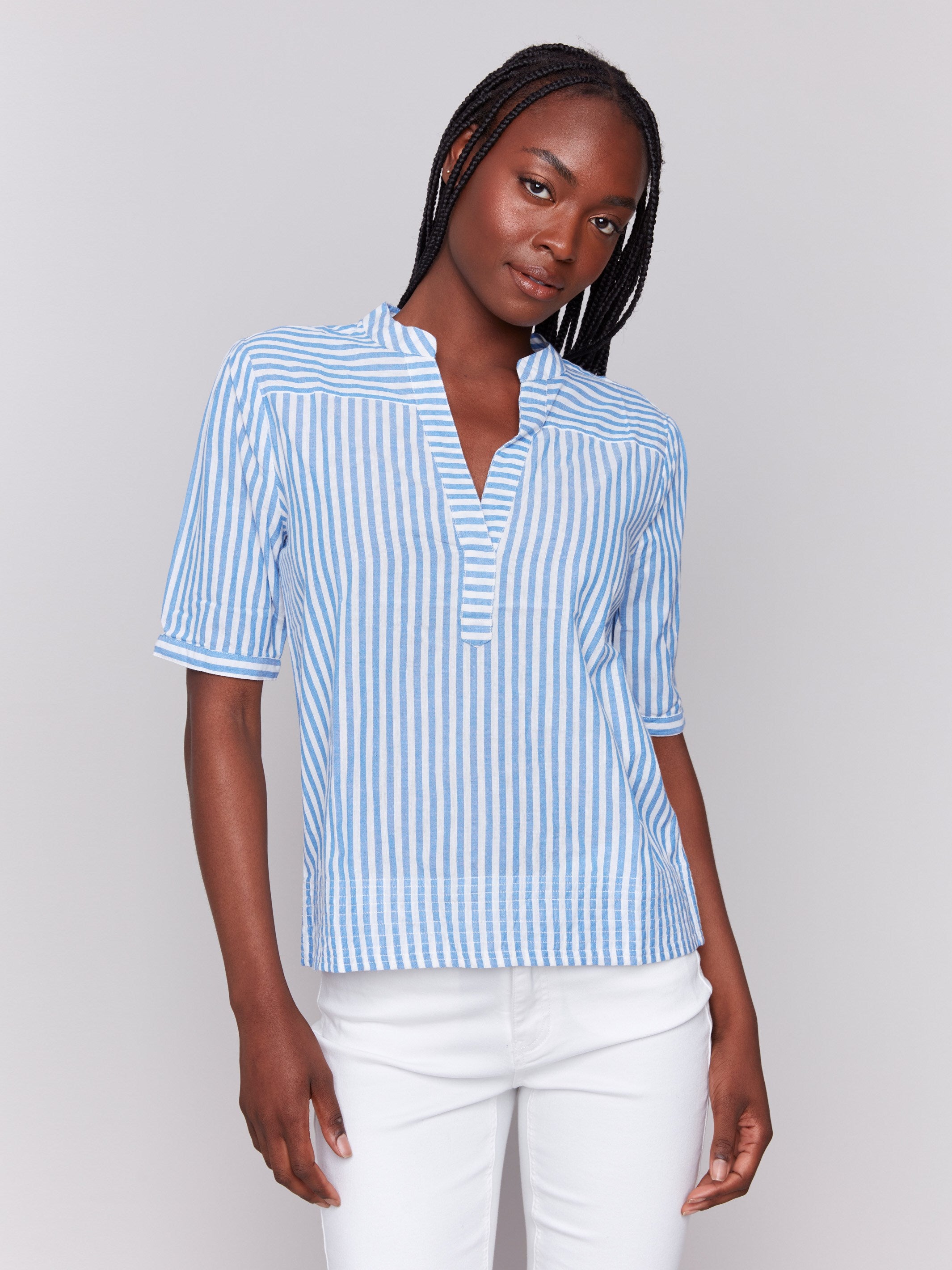 Striped Short Sleeve Popover Blouse - Denim