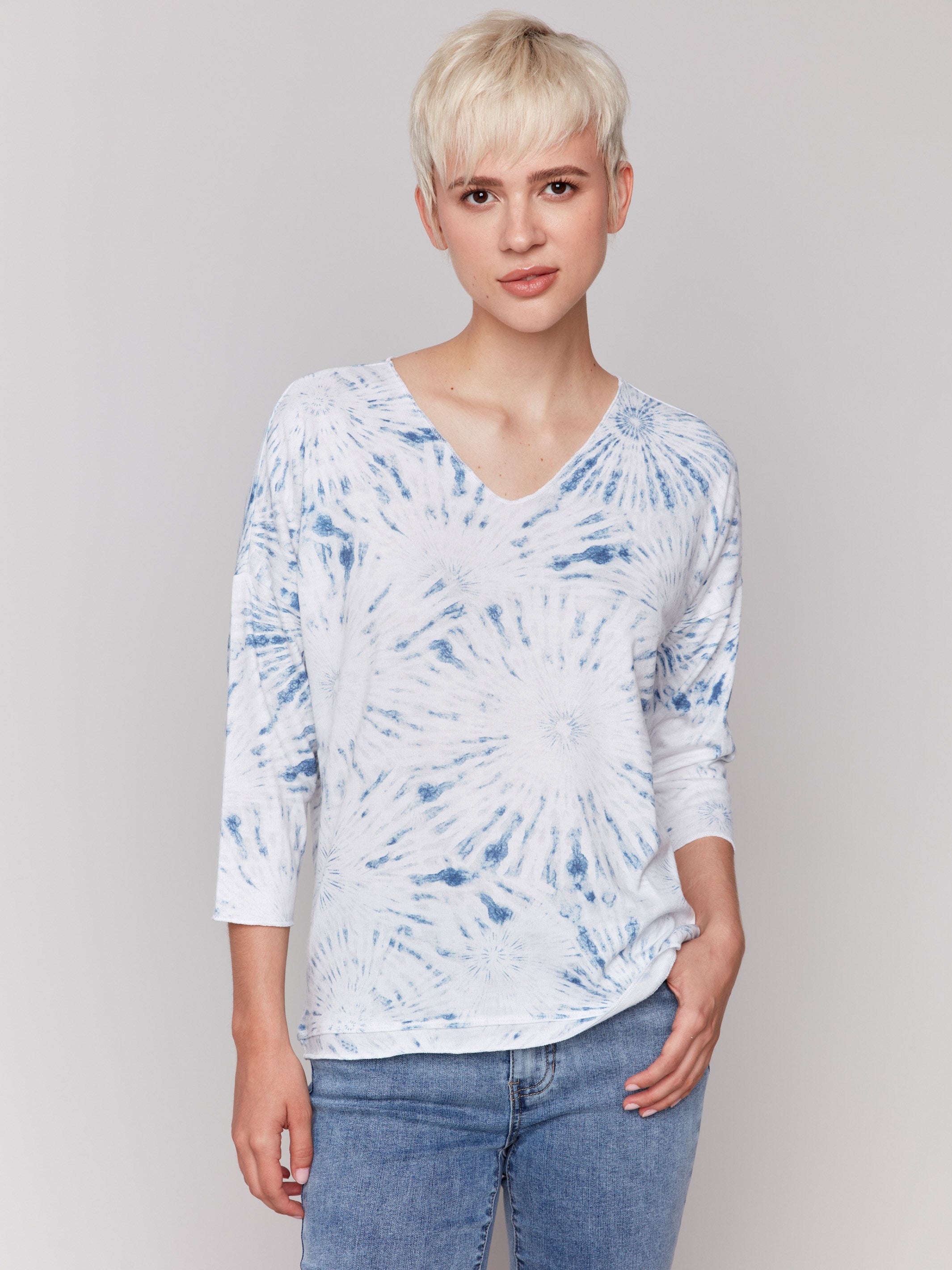Printed V-Neck Knit Top - Denim