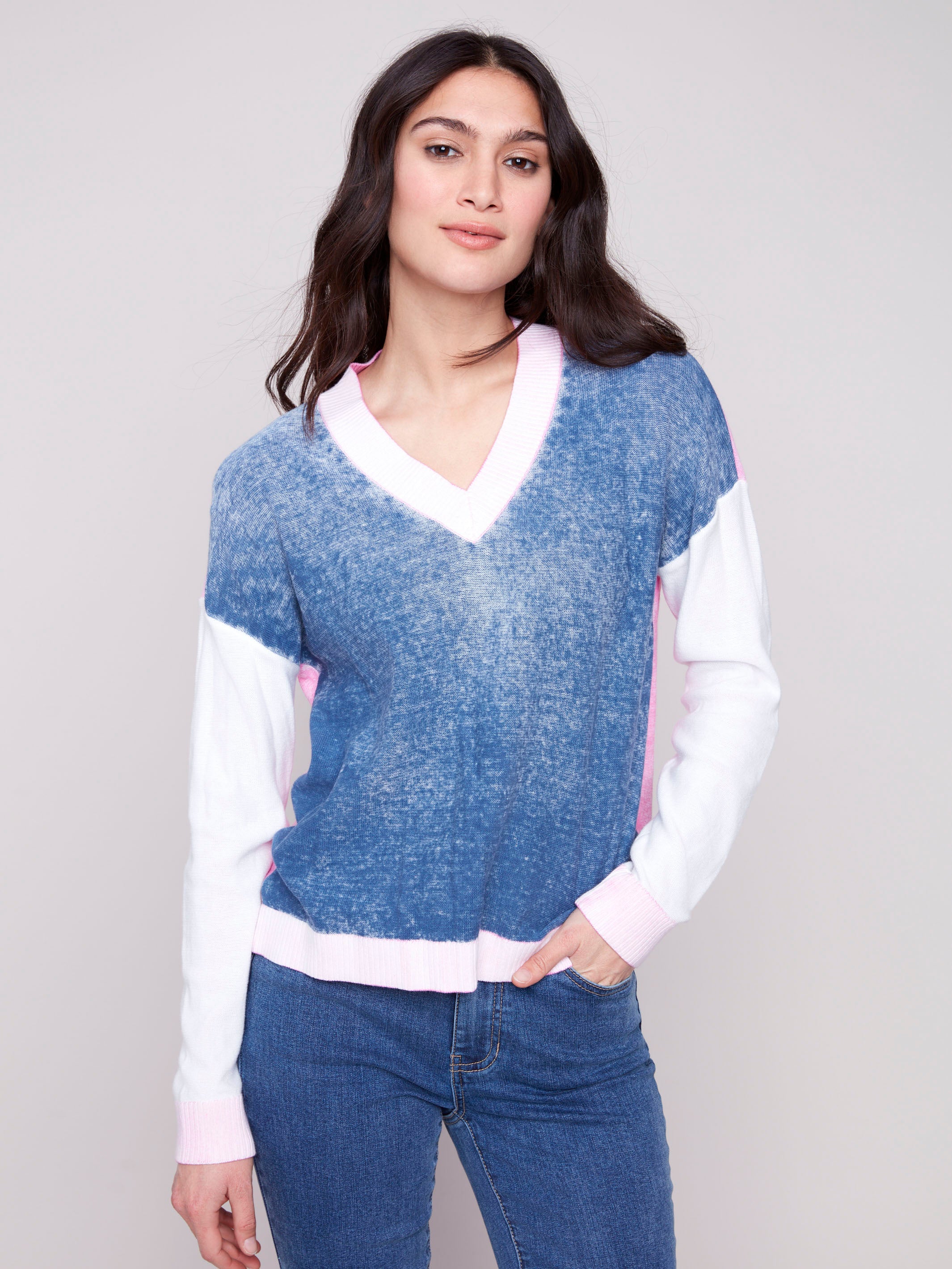 Color Block V-Neck Sweater - Denim