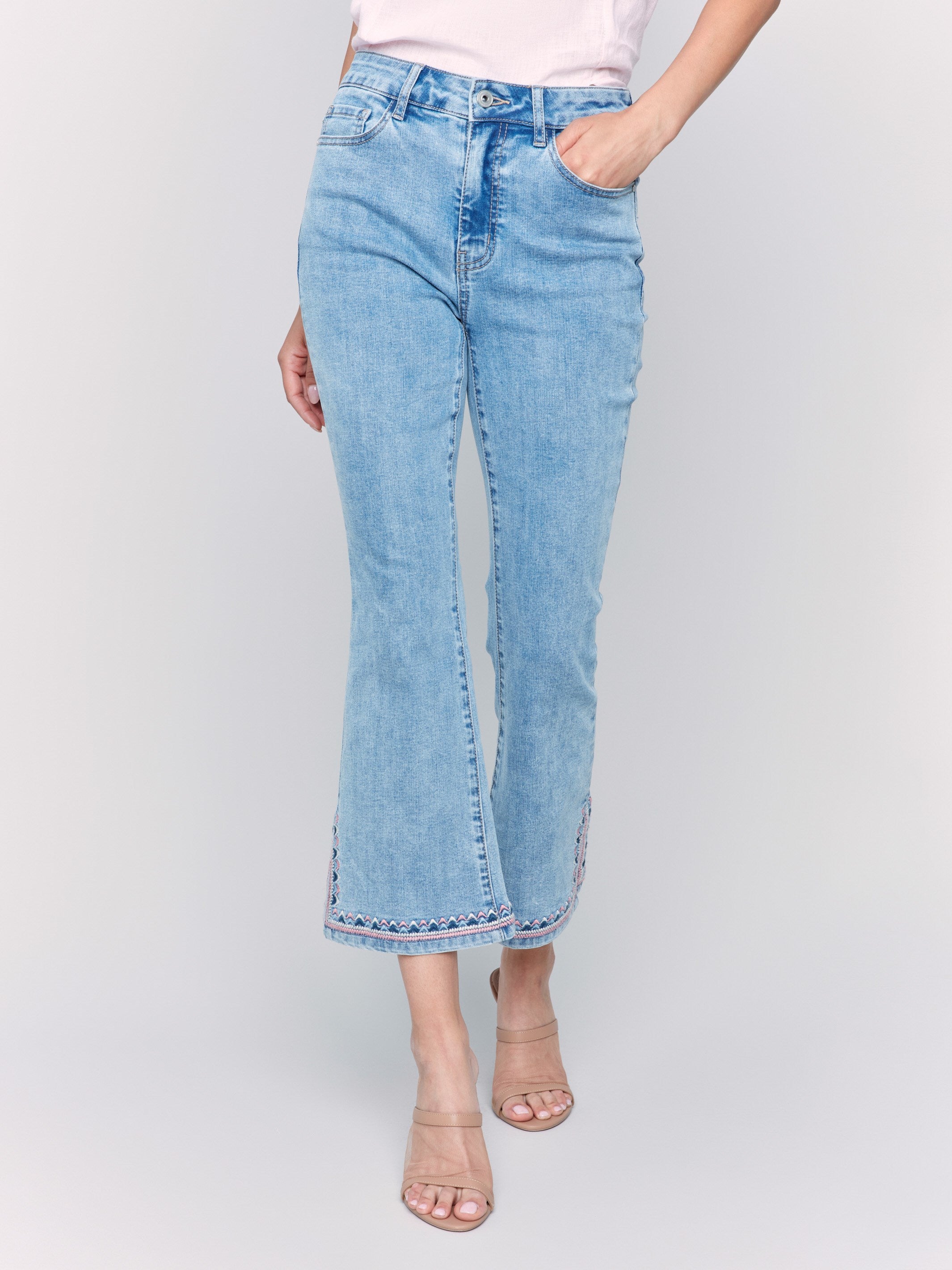 Cropped Bootcut Jeans with Embroidered Side Slit - Light Blue