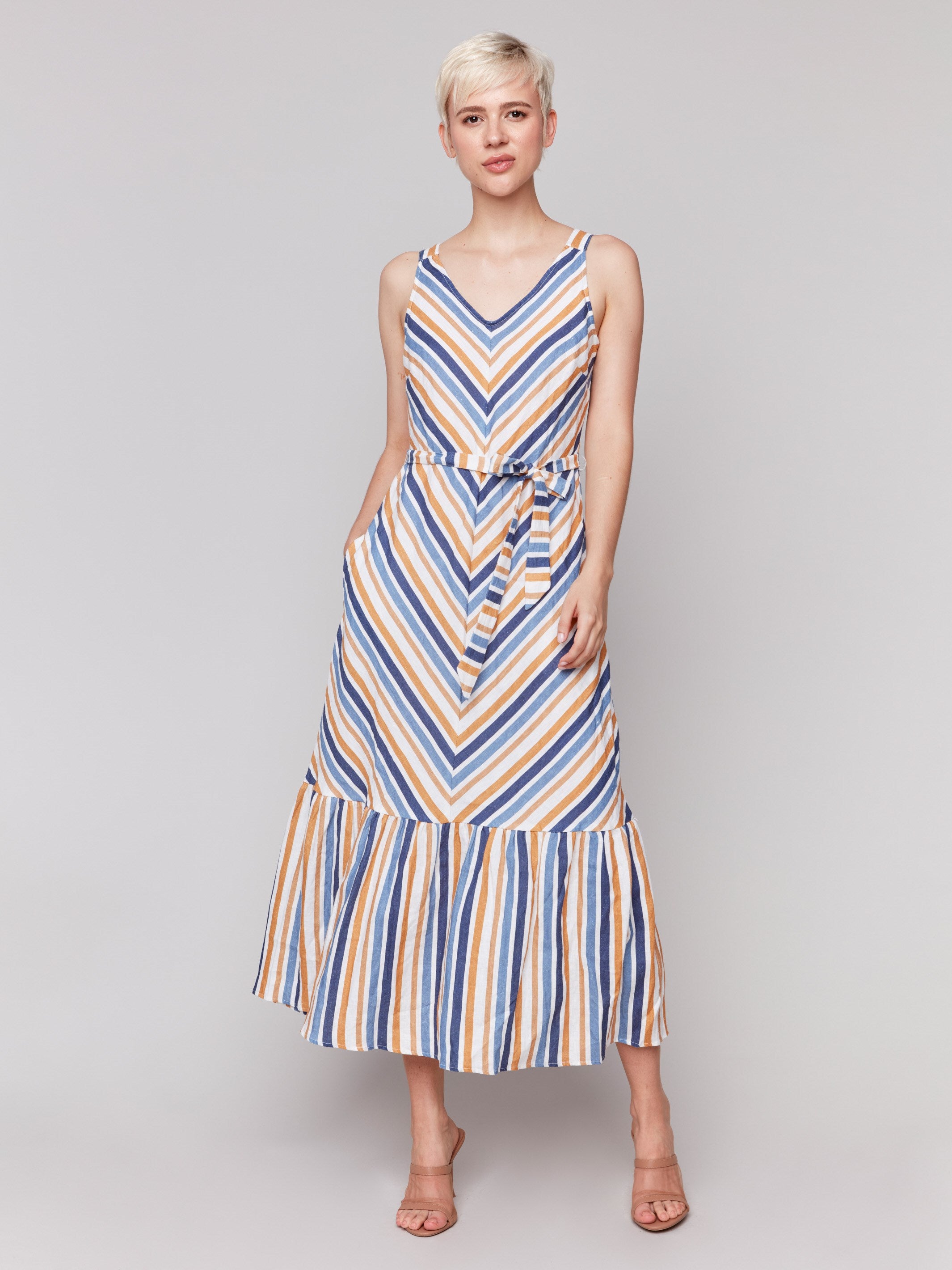 Striped Linen Blend Maxi Dress with Sash - Denim