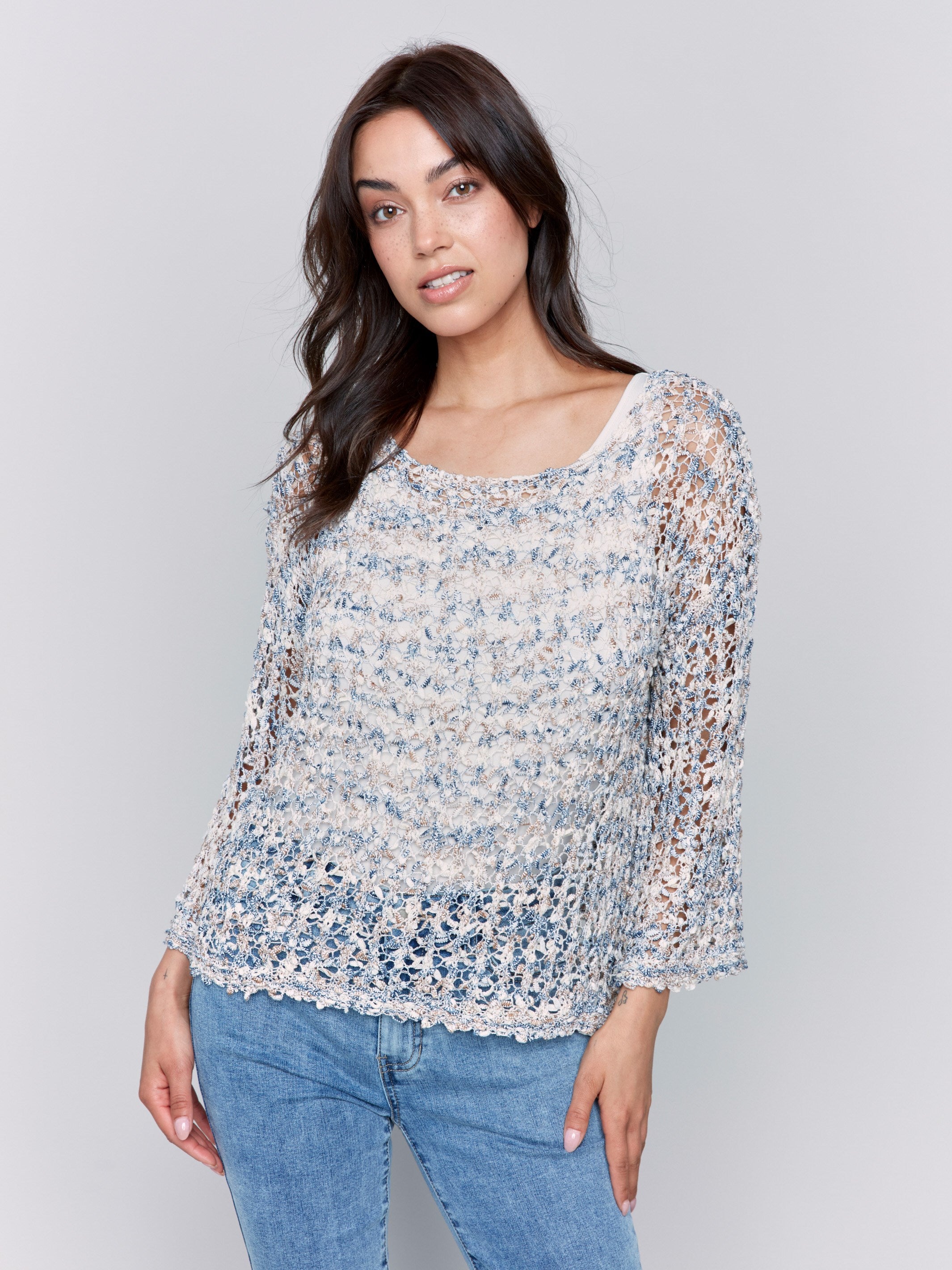 Braided Fishnet V-Neck Sweater - Denim