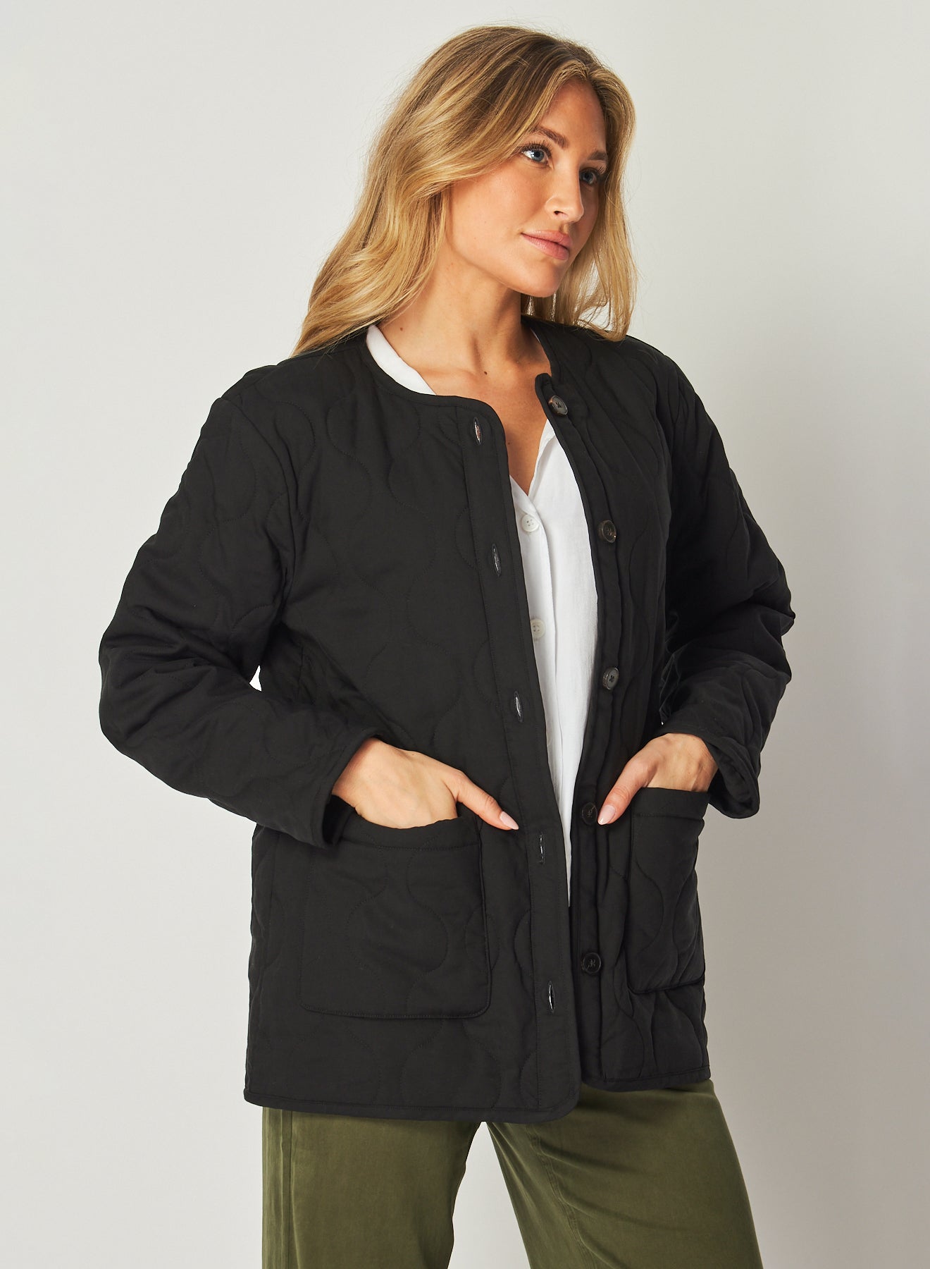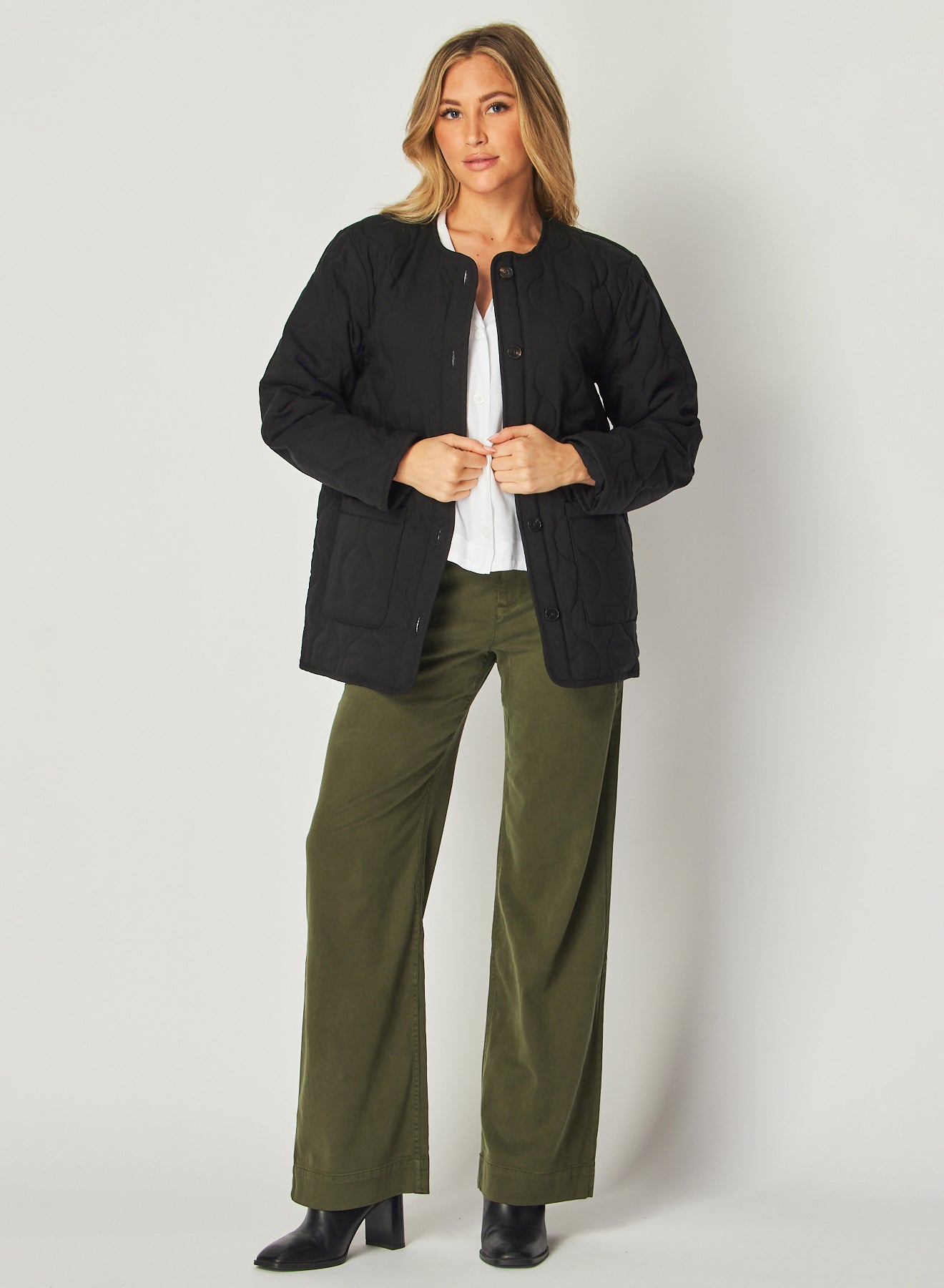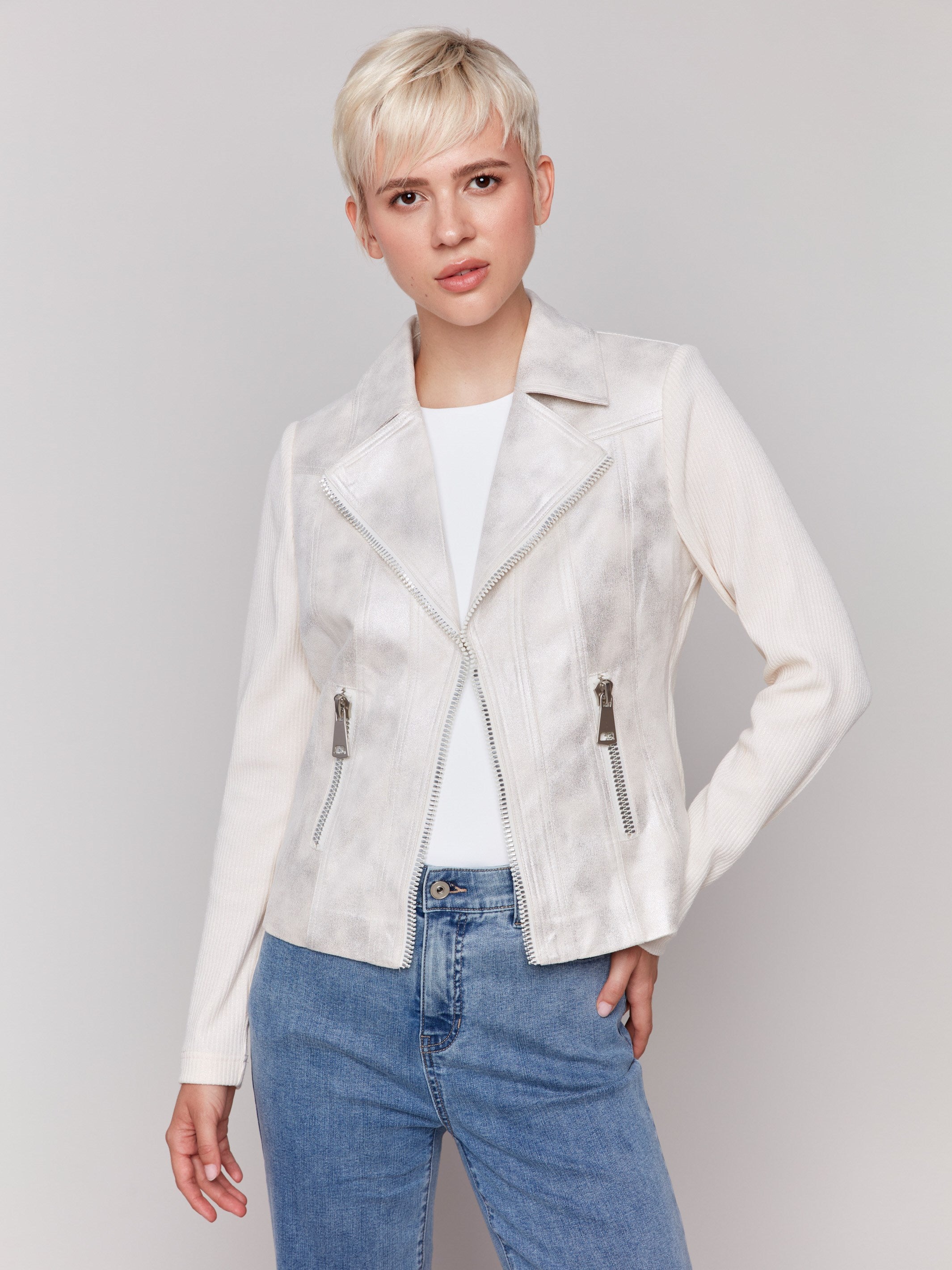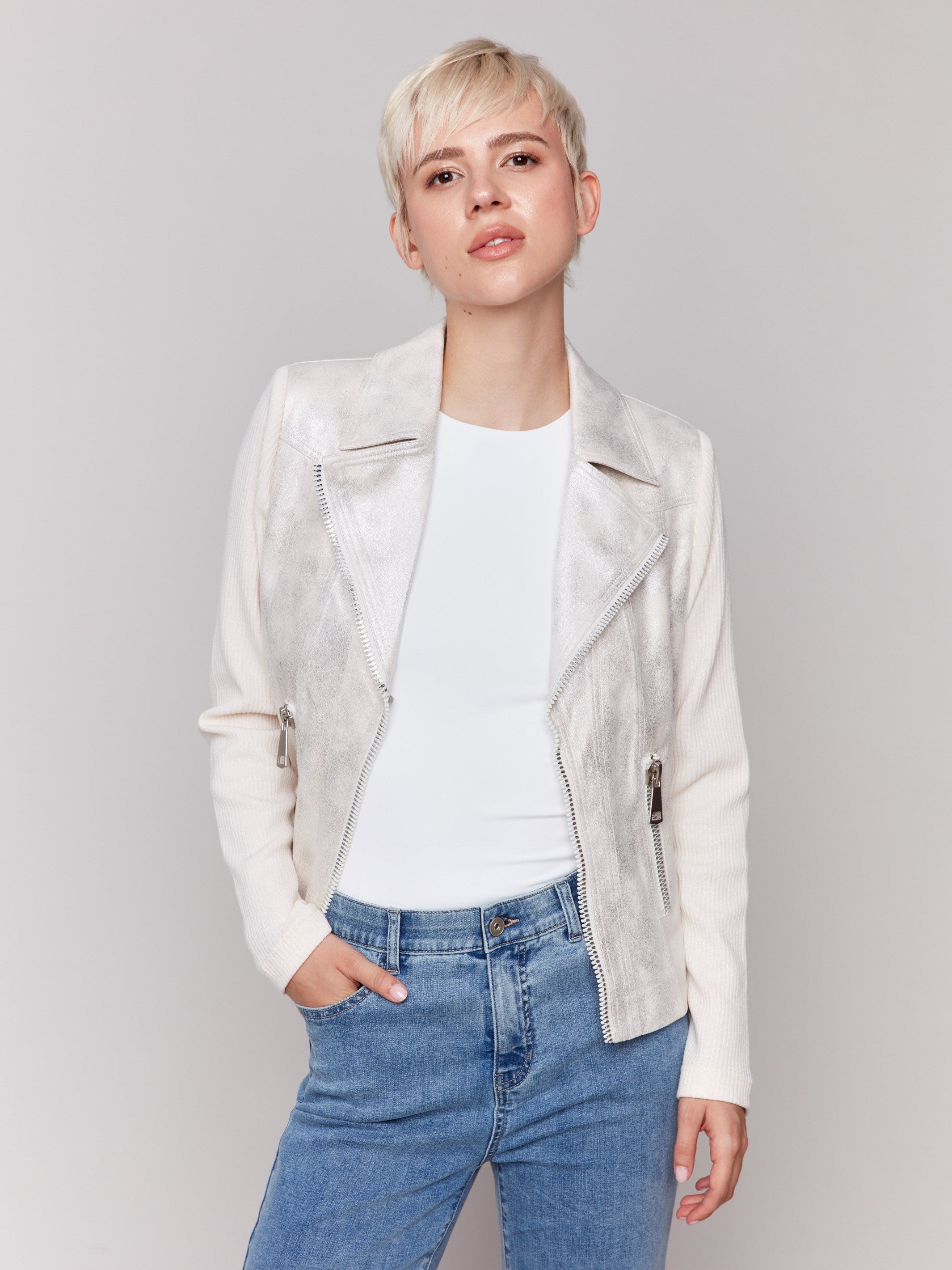 Foiled Faux Leather and Rib Knit Jacket - Champagne
